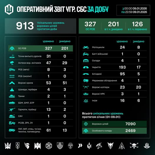 Загалом упродовж січня (01–09.01) знищено/уражено 7090 цілей, з них – 2469 особовий склад противника.
