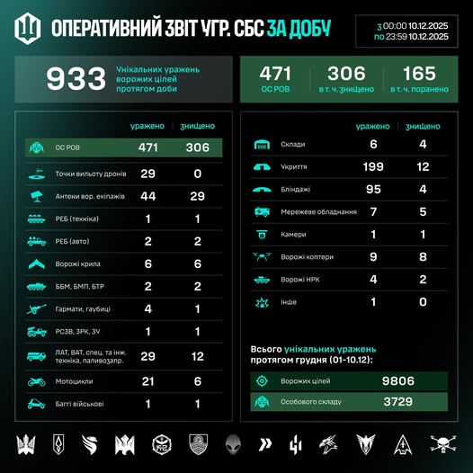 Загалом упродовж грудня (01–10.12) знищено/уражено 9806 цілей, з них 3729 – особовий склад противника.