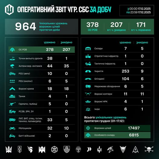 Загалом упродовж грудня (01–17.12) знищено/уражено 17497 цілей, з них 6815 – особовий склад противника.