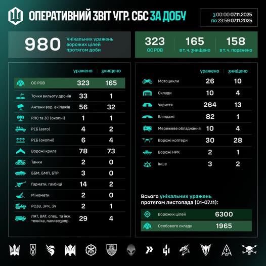 Загалом упродовж листопада (01–07.11) знищено/уражено 6300 цілей, з них 1965 – особовий склад противника.