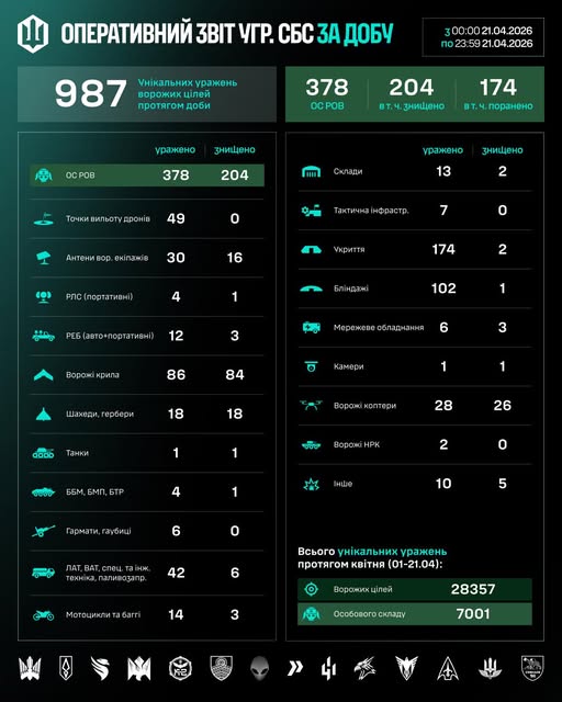 З початку квітня (01–21.04) підрозділами СБС уражено 28357 цілей противника, з них 7001 — особовий склад.