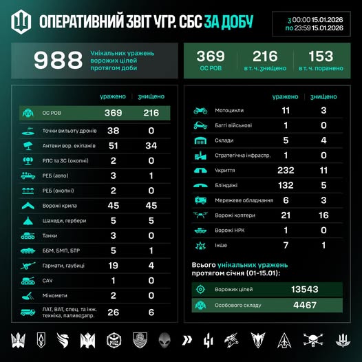 Загалом упродовж січня (01–15.01) знищено/уражено 13543 цілі, з них – 4467 особовий склад противника.