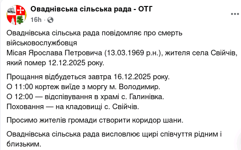 Сьогодні, 16 грудня, Волинь вшановує Героя Ярослава Місая 16-12-2025 09:49 Новини Стало відомо про смерть військовослужбовця Ярослава Місая, жителя села Свійчів Оваднівської громади. Серце захисника зупинилося 12 грудня. Висловлюємо щирі співчуття рідним і близьким загиблого воїна. Вічна пам’ять та вічна слава усім Захисникам України! Волинська обласна державна адміністрація