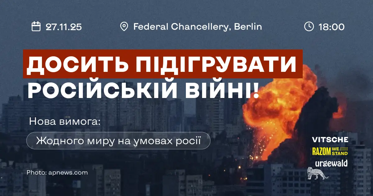Сьогодні, 27 листопада 2025 року, з 18:00 до 19:00 перед Федеральною канцелярією в Берліні.