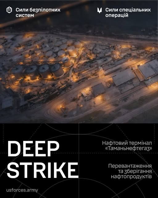 У ніч на 15 лютого оператори 1-го окремого центру СБС у взаємодії з ССО та ГУР МОУ уразили стратегічний об’єкт противника — експортний термінал нафти й нафтопродуктів «Таманьнефтегаз».