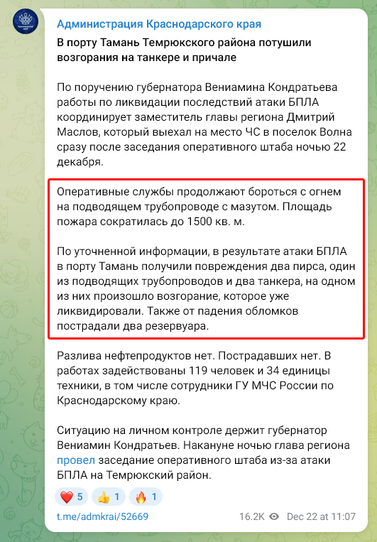 У ніч на 22 грудня оператори 1-го окремого центру СБС разом з підрозділом «Граф» СБС у взаємодії з іншими складовими Сил оборони успішно уразили стратегічний об’єкт противника – експортний термінал нафти та нафтопродуктів «Таманьнефтегаз».