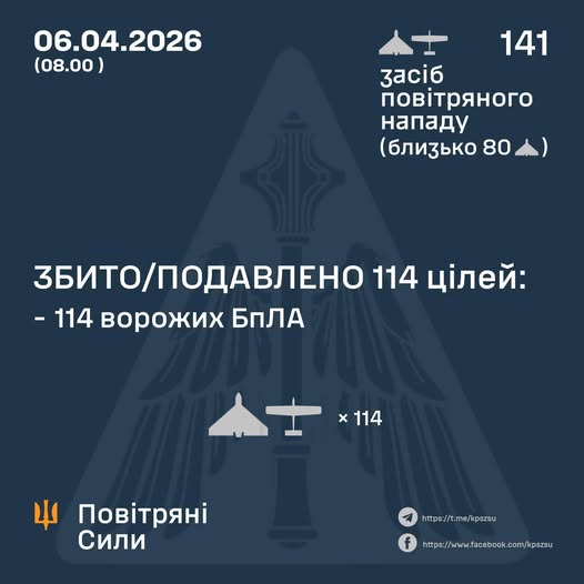 За попередніми даними, станом на 08:00, протиповітряною обороною збито/подавлено 114 ворожих БпЛА типу Shahed, Гербера, Італмас та дронів інших типів на півночі, півдні та сході країни.