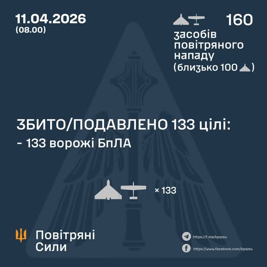 У ніч на 11 квітня (з 18:00 10 квітня) противник атакував 160 ударними БпЛА типу Shahed, Гербера, Італмас та безпілотниками інших типів із напрямків: Курськ, Орел, Міллерово, Приморсько-Ахтарськ – рф., ТОТ Донецьк, Чауда – ТОТ АР Крим, близько 100 із них – “шахеди”.