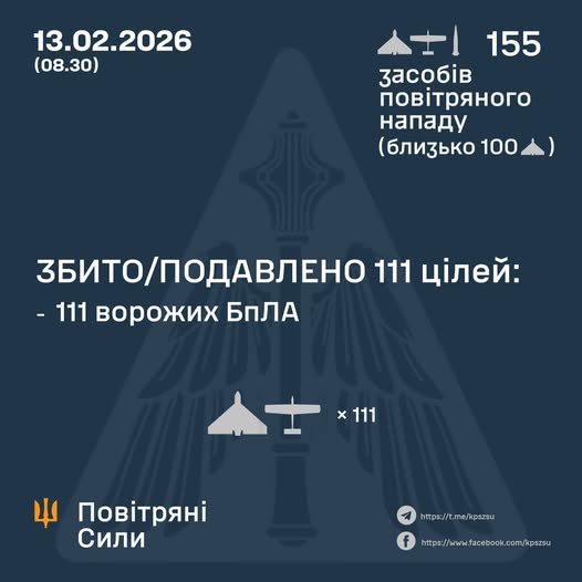 У ніч на 13 лютого (з 18:00 12 лютого) противник атакував балістичною ракетою Іскандер-М із Курської обл., а також 154 ударними БпЛА типу Shahed, Гербера, Італмас та безпілотниками інших типів із напрямків: Орел, Брянськ, Приморсько-Ахтарськ – рф., ТОТ Донецьк, Гвардійське, Чауда – ТОТ АР Крим, близько 100 із них – “шахеди”.