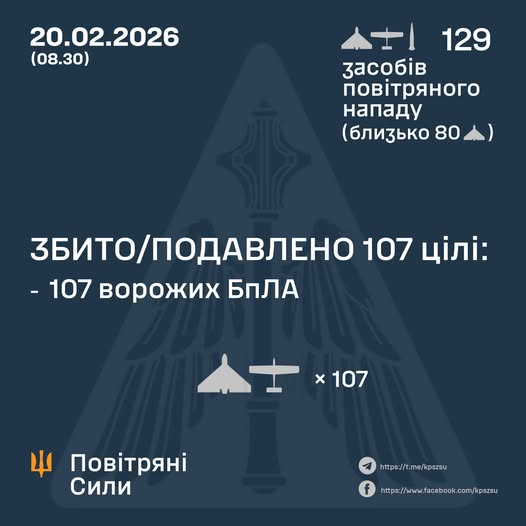У ніч на 20 лютого (з 18:00 19 лютого) противник атакував однією балістичною ракетою Іскандер-М із Ростовської обл. – рф, а також 128 ударними БпЛА типу Shahed, Гербера, Італмас та безпілотниками інших типів із напрямків: Брянськ, Курськ, Орел, Шаталово, Приморсько-Ахтарськ – рф., ТОТ Донецька обл., близько 80 із них – “шахеди”.