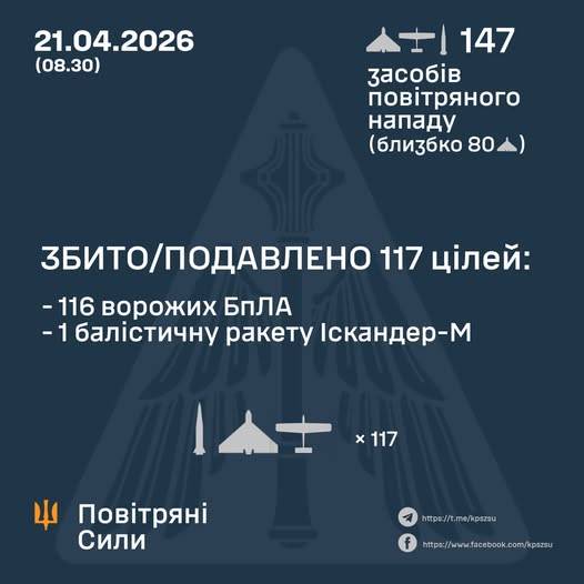 У ніч на 21 квітня (з 18:00 20 квітня) противник атакував двома балістичними ракетами Іскандер-М із Курської обл. – рф, та 143 ударними БпЛА типу Shahed, Гербера, Італмас та безпілотниками інших типів із напрямків:Курськ, Брянськ, Орел, Міллєрово, Приморсько-Ахтарськ – рф., Гвардійське, – ТОТ АР Крим, ТОТ Донецьк близько 80 із них – “шахеди”.