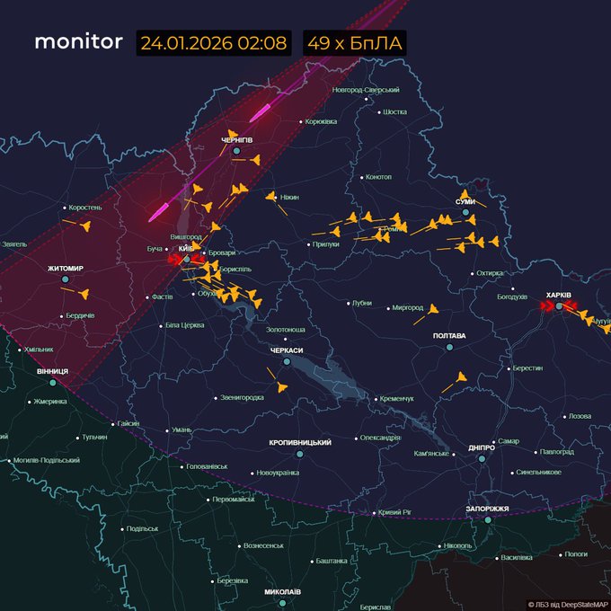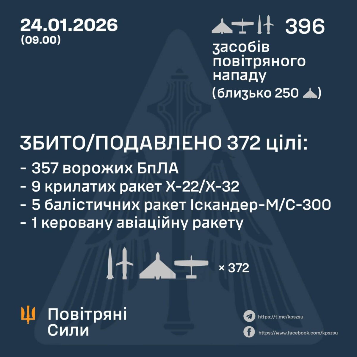 У ніч на 24 січня (з 18:00 23 січня) противник здійснив комбінований удар по Україні із застосуванням ракет різних типів повітряного, наземного базування та ударних БпЛА. Усього радіотехнічними військами Повітряних Сил зафіксовано 396 засобів повітряного нападу: