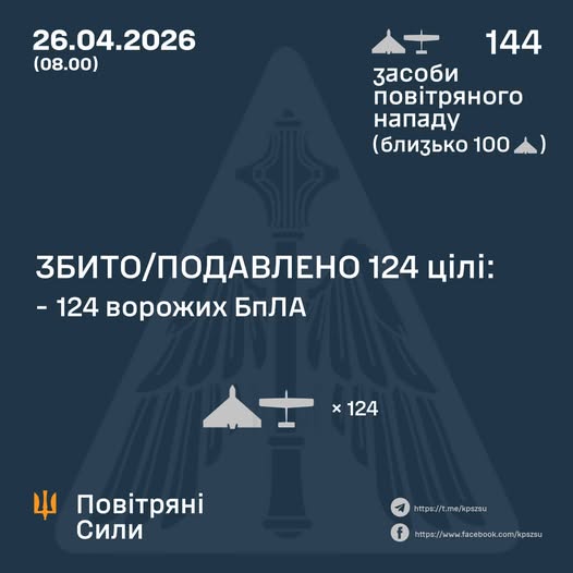 У ніч на 26 квітня (з 18:00 25 квітня) противник атакував 144 ударними БпЛА типу Shahed (в т.ч. реактивними), Гербера, Італмас та безпілотниками інших типів із напрямків: Курськ, Брянськ, Орел, Міллерово, Приморсько-Ахтарськ – рф., ТОТ Донецьк, близько 100 із них – “шахеди”.