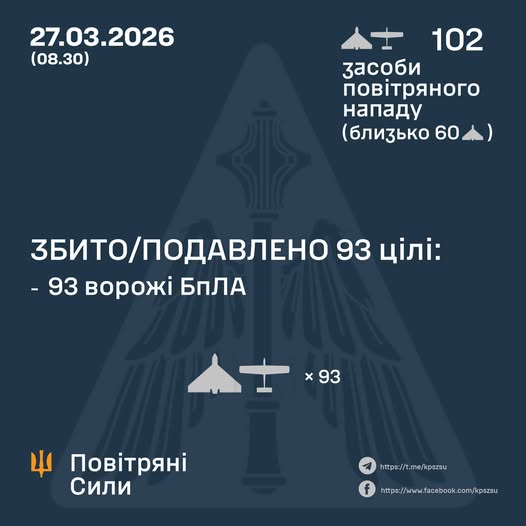 У ніч на 27 березня (з 18:00 26 березня) противник атакував 102 ударними БпЛА типу Shahed, Гербера, Італмас та безпілотниками інших типів із напрямків: Курськ, Орел, Міллєрово, Приморсько-Ахтарськ – рф., Гвардійське – ТОТ АР Крим, близько 60 із них – “шахеди”.