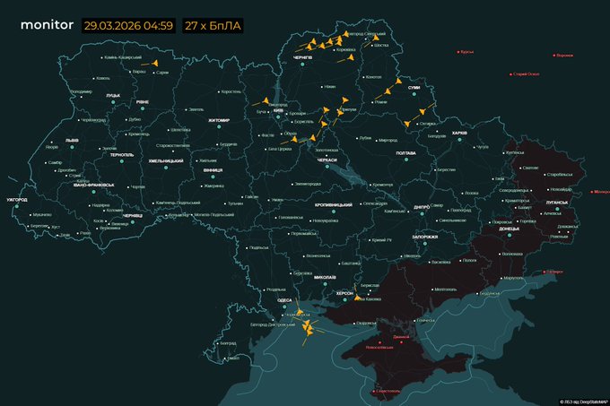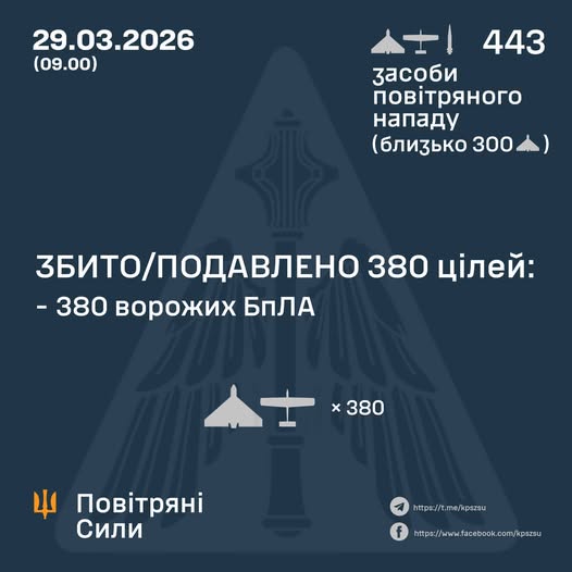 У ніч на 29 березня (з 18:00 28 березня) противник атакував аеробалістичною ракетою “Кинджал” (район пуску – повітряний простір Рязанської обл.) та 442 ударними БпЛА типу Shahed, Гербера, Італмас та безпілотниками інших типів із напрямків: Брянськ, Курськ, Орел, Міллерово, Приморсько-Ахтарськ – рф., Гвардійське, Чауда – ТОТ АР Крим, близько 300 із них – “шахеди”.