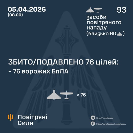 У ніч на 05 квітня (з 18:00 04 квітня) противник атакував 93 ударними БпЛА типу Shahed, Гербера, Італмас та безпілотниками інших типів із напрямків: Брянськ, Курськ, Орел, Міллерово, Приморсько-Ахтарськ – рф., Гвардійське – ТОТ АР Крим, близько 60 із них – “шахеди”.