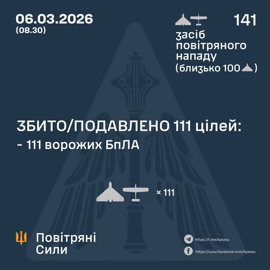 У ніч на 06 березня (з 18:00 05 березня) противник атакував 141 ударним БпЛА типу Shahed, Гербера, Італмас та безпілотниками інших типів із напрямків: Орел, Брянськ, Курськ, Міллерово, Шаталово, Приморсько-Ахтарськ – рф., Гвардійське, Чауда – ТОТ АР Крим, близько 100 із них – “шахеди”.