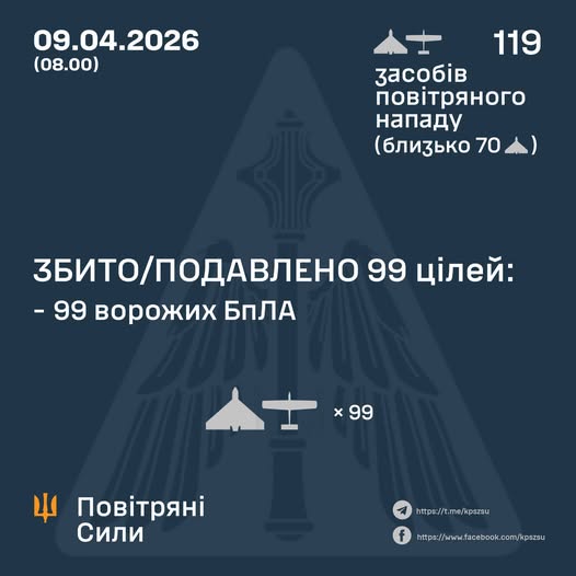 У ніч на 9 квітня (з 18:00 8 квітня) противник атакував 119 ударними БпЛА типу Shahed, Гербера, Італмас та безпілотниками інших типів із напрямків: Брянськ, Курськ, Орел, Міллерово, Приморсько-Ахтарськ – рф., Гвардійське – ТОТ АР Крим, Донецьк, близько 70 із них – “шахеди”.