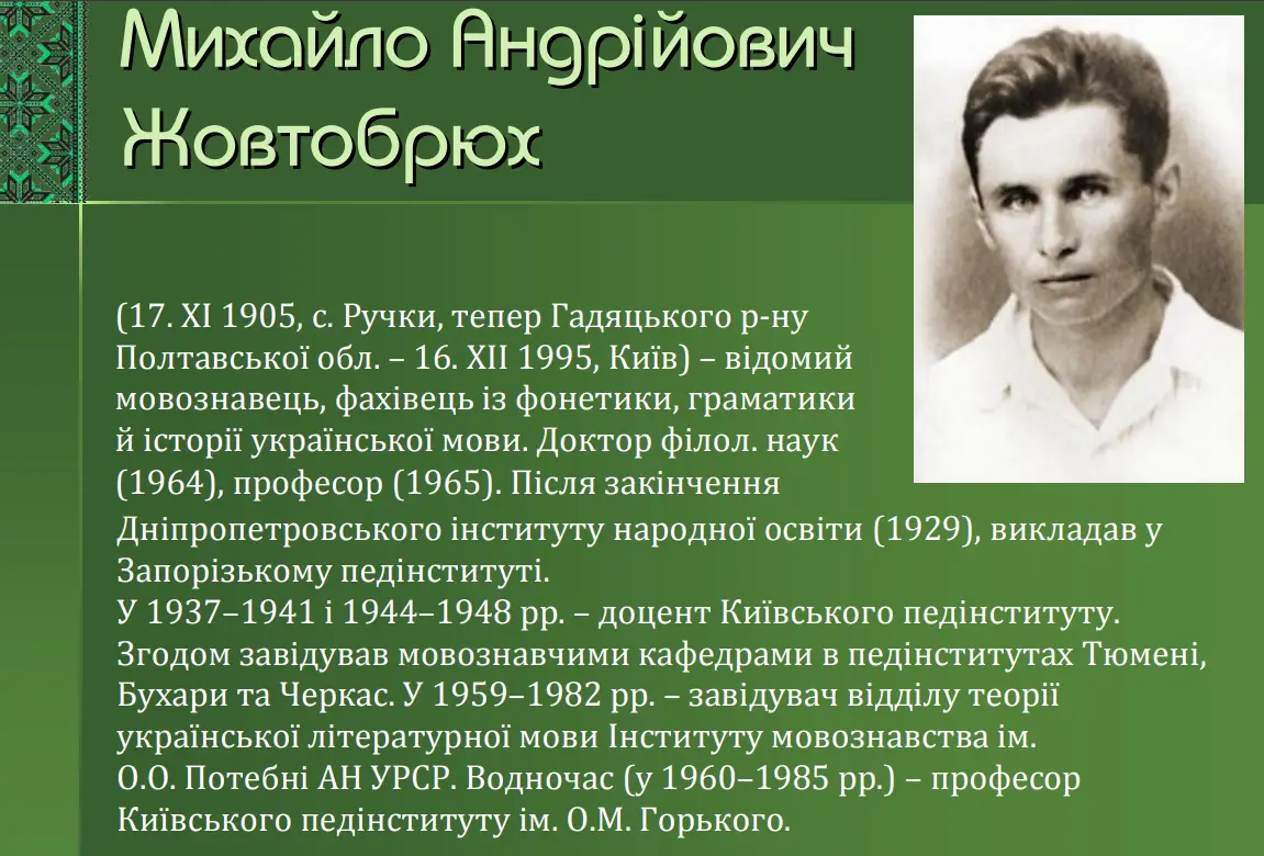 Довідково: 17 листопада 1905 року у селі Ручки на Полтавщині народився Михайло Жовтобрюх. Батьки були селянами, тож із шести років довелося порати корову та ходити за плугом. Проте батько, який брав участь у Першій світовій війні, написав додому листа, у якому просив відправити сина в науку, бо «малограмотним страшенно важко в солдатах». І майбутній мовознавець навчався: у Ручківській чотирічній школі, школі містечка Комишня, а далі у Гадячі, у минулому гетьманській столиці і родовому гнізді Драгоманових-Косачів, де у 20-х роках 20-го століття діяли трирічні педагогічні курси. Так згадував малу батьківщину: «Люблю я своє славне село, мої рідні Ручки на Хоролі», «буваю в рідних місцях. і на тій стежці біля Хорола, яка вела і завжди веде до села». Мріяв про вищу освіту, невдовзі задумане здійснилося. У 1929 році закінчив мовно-літературне відділення факультету професійної освіти Дніпропетровського інституту народної освіти й отримав кваліфікацію викладача української мови та літератури. У с. Попівщина Роменського району Сумської області працював учителем початкових класів. Мешкав у місті Харцизьк на Донеччині, у Дніпрі та Запоріжжі, де навчав української мови старшокласників й студентів у місцевих вишах. У Київському педінституті пройшов шлях від старшого викладача до доцента, завідувача кафедри, декана мовно-літературного факультету, заступника директора з навчально-виховної роботи.