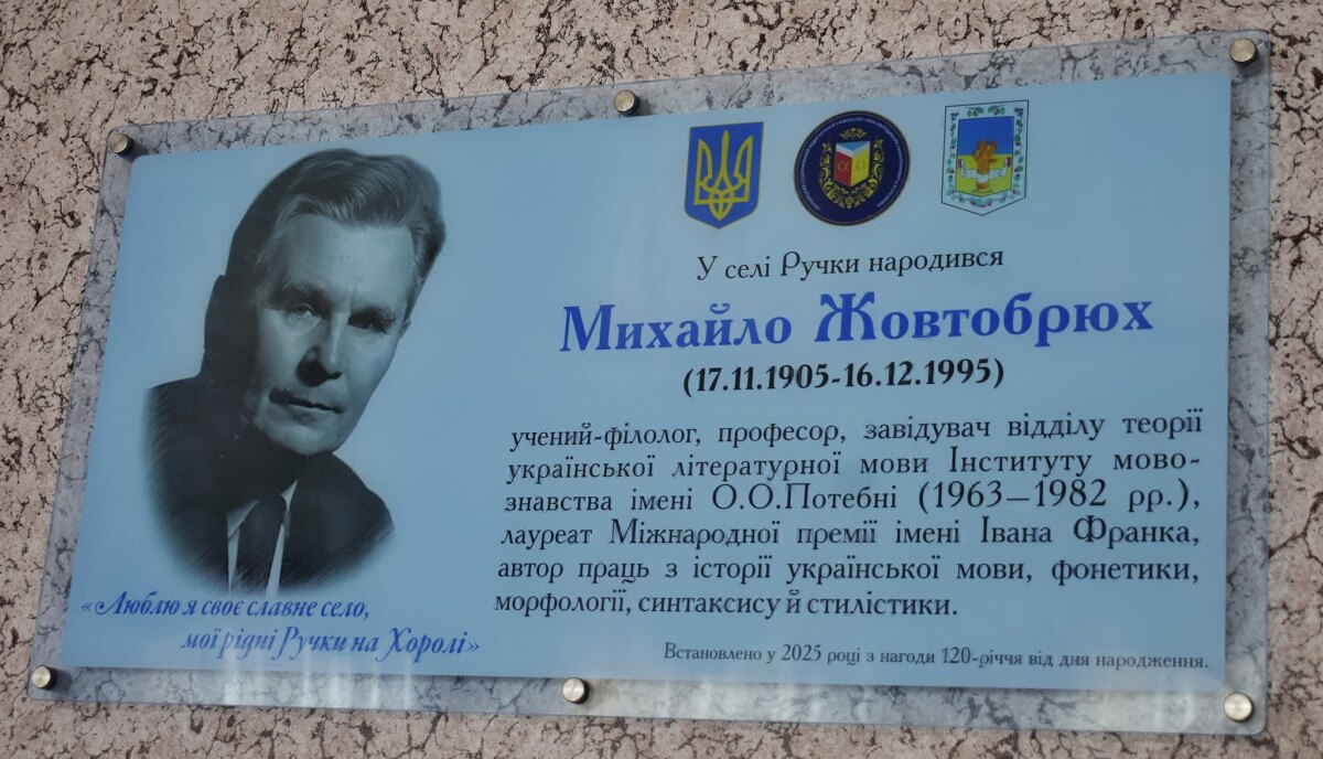 За ініціативи представника Українського інституту національної пам’яті в Полтавській області Олега Пустовгара, ректорки Полтавського національного педагогічного університету (ПНПУ) Марини Гриньової та директорки Департаменту культури і туризму Полтавської ОВА Ірини Удовіченко у селі Ручки Петрівсько-Роменської громади Миргородського району урочисто відкрили меморіальну дошку в пам’ять про Михайла Жовтобрюха – класика української філології, видатного мовознавця, професора, автора понад 300 мовознавчих праць, підручників з курсу сучасної української мови, монографій «Мова української преси», «Українська граматика» та ін. Профінансував створення педуніверситет, а менеджентували процес виготовлення меморіальної дошки й сформулювали напис на ній Олег Пустовгар та Валентина Орєхова – директорка наукової бібліотеки ПНПУ імені Михайла Жовтобрюха.