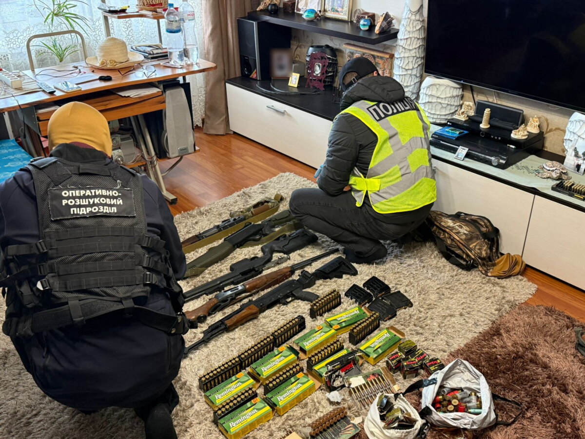 За результатами обшуків виявлено та вилучено автомат АКМС калібру 7,62 мм., снайперська гвинтівка СВД, гвинтівка Мосіна, карабін Вінчестер, пристрій для відстрілу гумових куль Escort Magnum та кілька сотень набоїв до вказаної зброї.