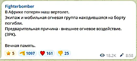 Ось уже рік, як російські воєнкори скаржаться, що Україна втручається у внутрішні російські справи в Африці, бо українські інструктори вчать, а потім і командують місцевими повстанцями в країнах, де росія організувала путчі та привела своїх ставленників до влади. Насамперед це центральна Африка, де Ваґнерівці та їх наступники відібрали у французів золоті приїски і використовують прибуток для фінансування війни з Україною. Французький Іноземний Леґіон виявився безпорадним у боротьбі з російськими розбишаками. Однак, коли у війну втрутилися місцеві повстанці, навчені Гурівцями, ситуація почала змінюватися. Росіяни почали нести відчутні втрати, втрачати території та прибуток. Вчора туареги захопили в Лівії центр провінції, заселеної переважно цим народом, а потім повстанці збили в сусідньому Малі поблизу міста Гао російський гелікоптер з десантною групою на борту.