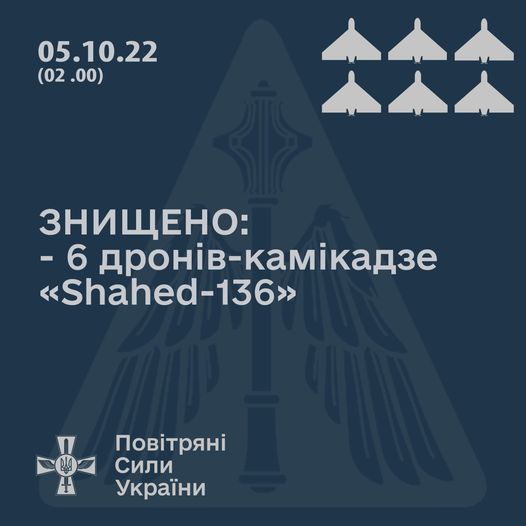 Уночі збито 6 дронів-камікадзе Shahed-136 05-10-2022 06:58 Новини Уночі 5 жовтня російські окупаційні війська атакували Україну безпілотниками-камікадзе “Shahed-136”. Шість дронів-камікадзе знищено зенітними ракетними підрозділами Повітряних Сил на півдні країни. Повітряне командування “Захід” Повітряних Сил ЗС України