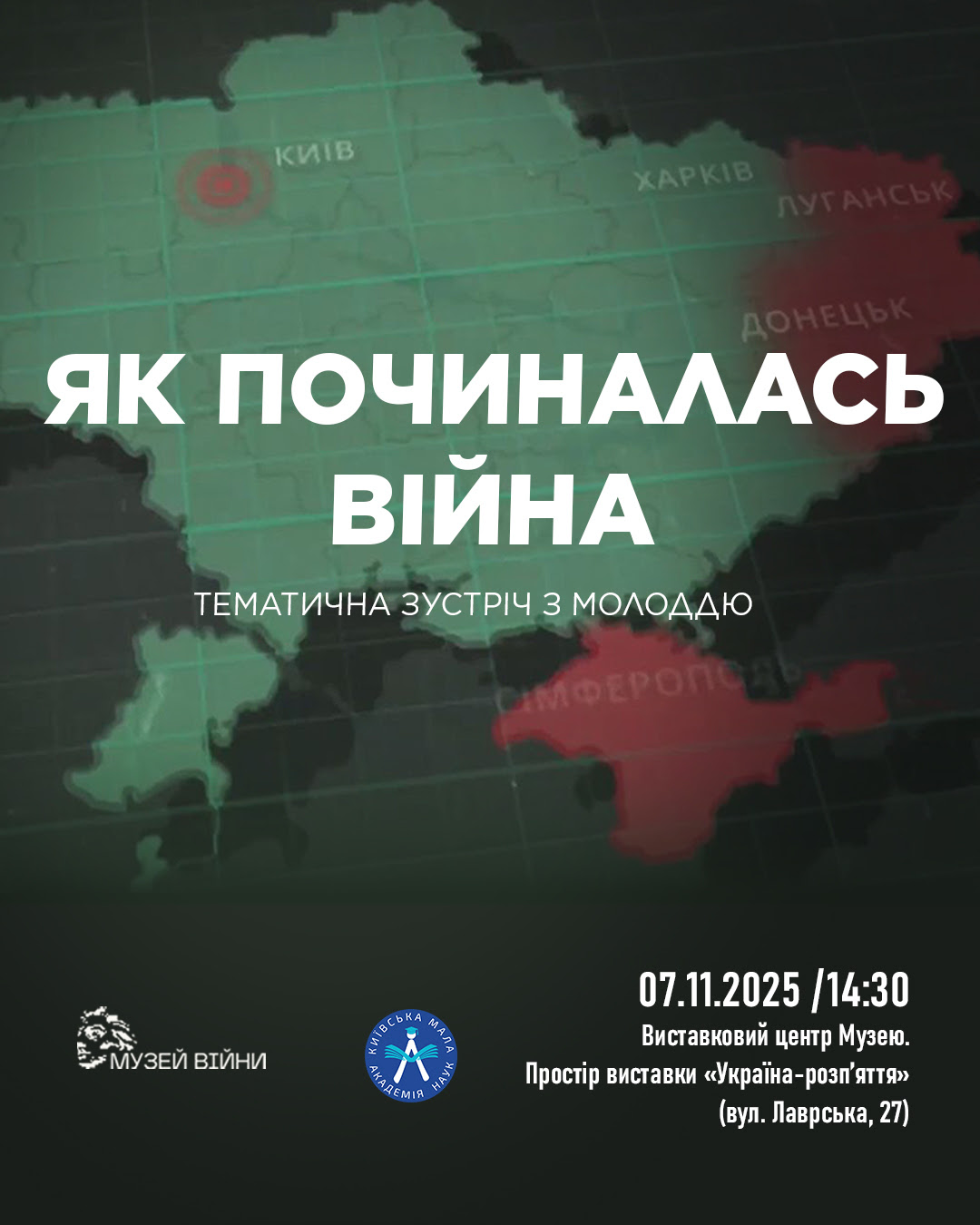 7 листопада 2025 р. о 14:30 у Виставковому центрі Національного музею історії України у Другій світовій війні відбудеться освітня зустріч у межах музейного проєкту «Як починалась війна». Подія присвячена вшануванню мужності та стійкості українських захисників і осмисленню подій, що стали передумовою широкомасштабної російської агресії у 2022 р.