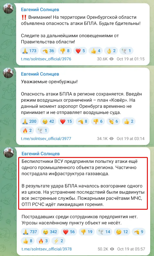 Два місяці тому українські дрони зробили пробний наліт на Оренбург і 11 серпня атакували «Оренбургский гелиевый завод». Але тоді російська влада відговорилася, що відбулося загорання при ремонті обладнання. Тепер відговоритися стало неможливо.