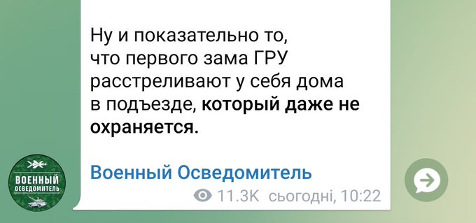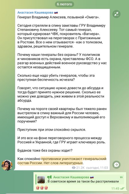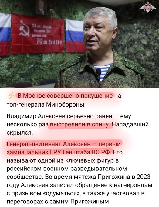 6 лютого у Москві скоїли замах на генерал-лейтенанта Володимира Алєксєєва, першого заступника начальника Головного розвідувального управління Генштабу ЗС РФ (ГУ ГШ). Його безпосередній керівник бере участь в переговорах з українською делегацією в Абу-дабі.