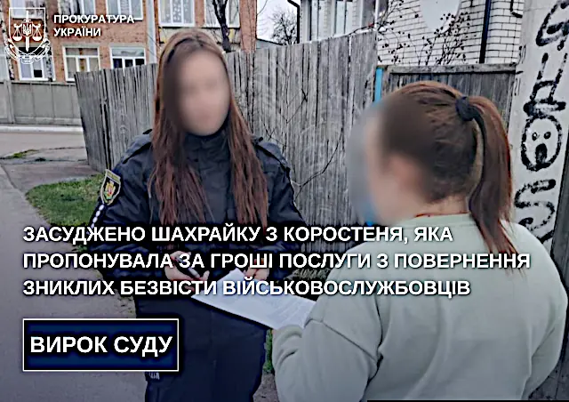Встановлено, що 31-річна жінка упродовж 2025 року здійснювала пошук потерпілих серед найбільш уразливої категорії відвідувачів Коростенської організації Товариства Червоного Хреста України – родичів безвісти зниклих військовослужбовців Збройних сил України.