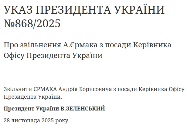 Андрія Єрмака звільнено з посади керівника Офісу Президента. Відповідний Указ підписав президент Володимир Зеленський 28 листопада.