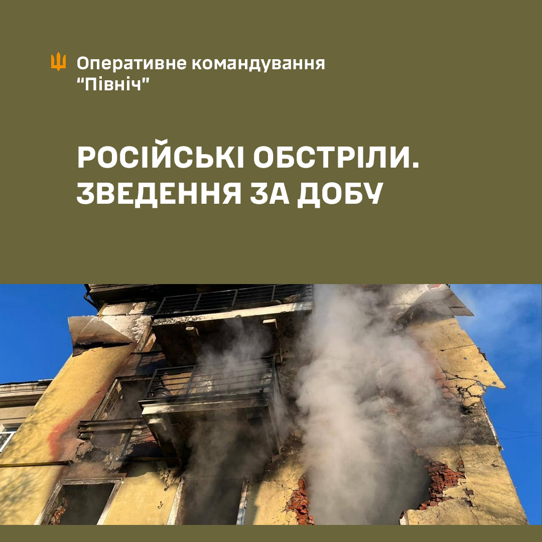 Сумщина: російські війська здійснили майже 80 обстрілів по 40 населених пунктах у 17 територіальних громадах. Один цивільний загинув, восьмеро дістали поранень.