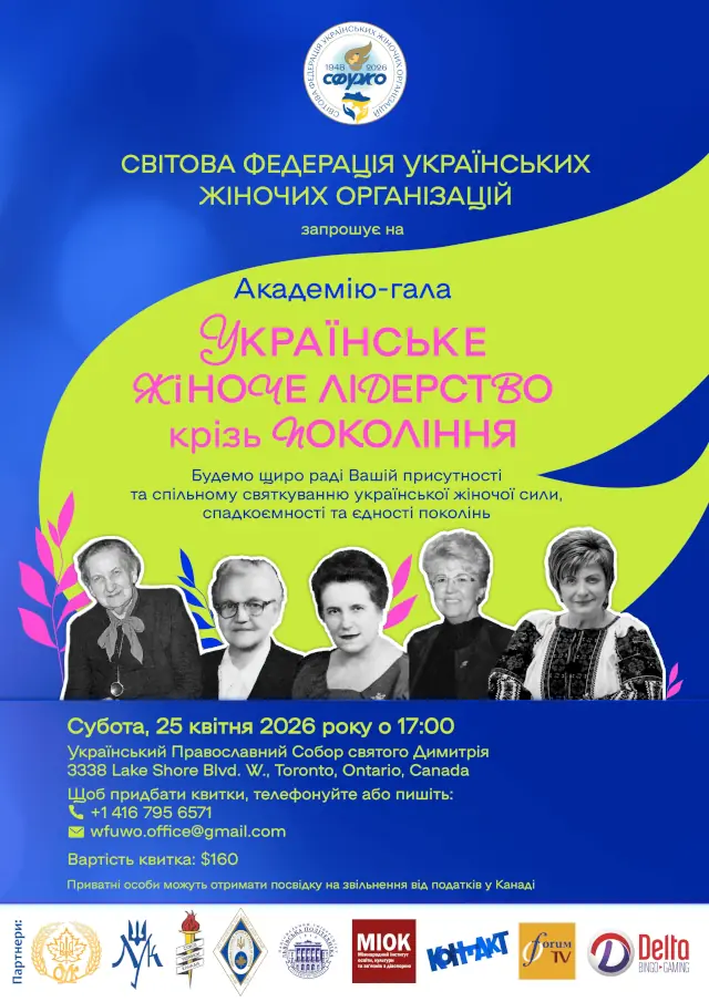 25 квітня 2026 року в Торонто відбудеться Академія-гала Світової Федерації Українських Жіночих Організацій (СФУЖО), присвячена вшануванню провідниць українського жіночого руху в Канаді та світі. Подія поєднає пам’ять про тих, хто відійшов у вічність, із визнанням внеску сучасних лідерок та підкреслить тяглість жіночого служіння Україні.