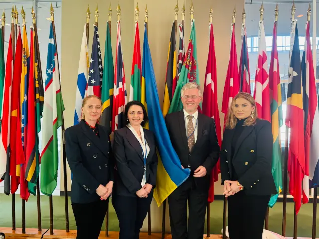 (Зліва): Марія Чухнова, Зоряна Головата, Посол Андрій Мельник — Постійний представник України при ООН, Христина Гайовишин — заступниця Постійного представника України при ООН — у штаб-квартирі ООН, Delegates’ Lounge
