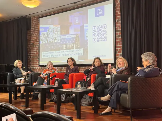 Захід «Power, Representation, and the Future of the UN». На фото: спікерки заходу Марія Елена Аґуеро, Сусана Малкорра, посол Мелані Вервір, Ана Хіменес, посол Дар’я Бавдаж Курет та Алісія Буенростро