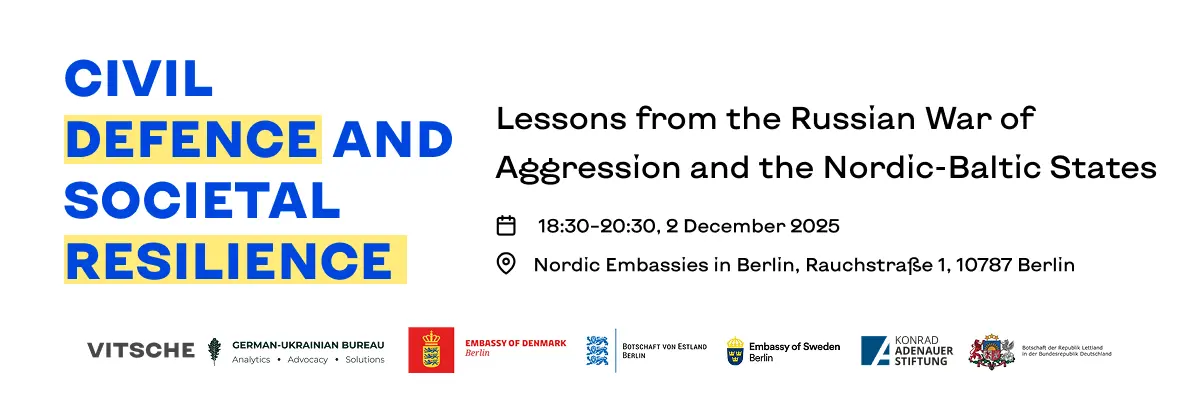 2 грудня провідні експерти з Північно-Балтійського регіону, України та Німеччини зберуться в Берліні, щоб обговорити практичні підходи до цивільного захисту та суспільної стійкості — від готовності населення і стратегічної комунікації до співпраці між державними структурами, бізнесом та волонтерами.