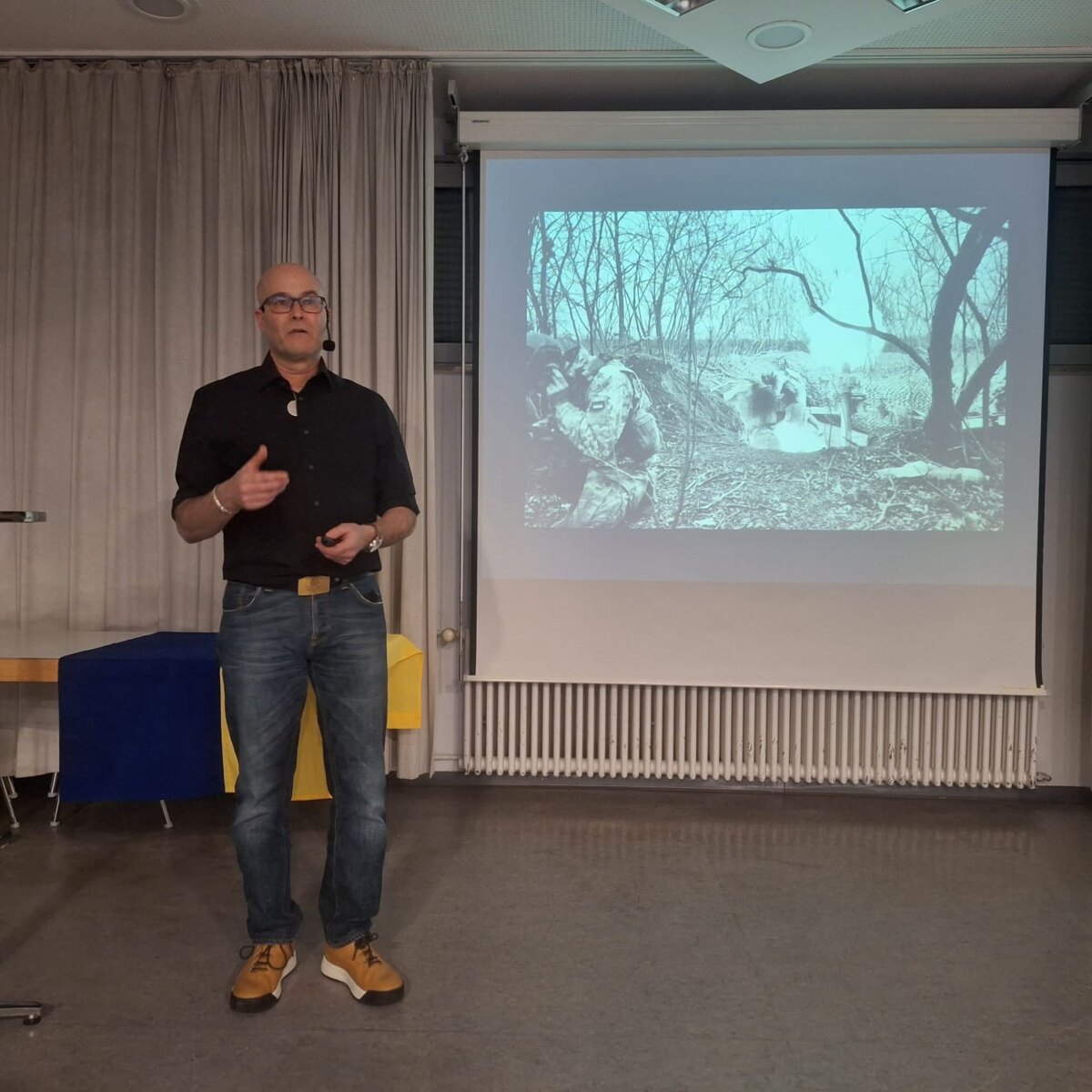 Гість вже вчетверте зустрічається з жителями міста. Він ще з 2017 року висвітлює події в Україні, а з початку повномасштабного вторгнення щомісяця відвідує її, документуючи бойові дії безпосередньо на місці. У своїй фото-доповіді «WIDERSTAND – Freiheitskampf der Ukraine» він представив різноманітні, надзвичайні світлини та поділився новими особистими враженнями.