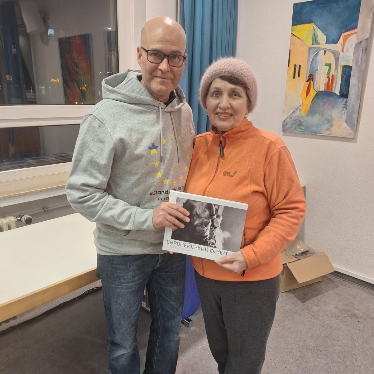Після офіційної частини, було неформальне спілкування біля столика, на якому лежали книжки Тіля Маєра. Це вже сьоме його надбання. «Європейський фронт. Війна в Україні» – таку назву носить книга, яка розповідає читачам про Бахмут, Авдіївку, Одесу, Херсон, Миколаїв, Київ, Черкаси, Куп’янськ, Кремінну та інші міста і села, де фотокамера невтомного майстра фіксувала злочини рашистів проти мирного населення, позбавлення нормального життя: зиму в підвалах, життя у квартирах і будинках без опалення, без світла і води. Все це показано через емоції постраждалих людей, чиї життя сколихнула війна. Прагнення познайомити європейців з Україною досягає своїх цілей, показуючи, що у центрі Європи йде повномасштабна, кривава війна. Проте Тілль висловив свою точку зору – допомога від Європи недостатня для тих, хто став щитом на дорозі війни. Платиться дуже дорога ціна – життям українців.