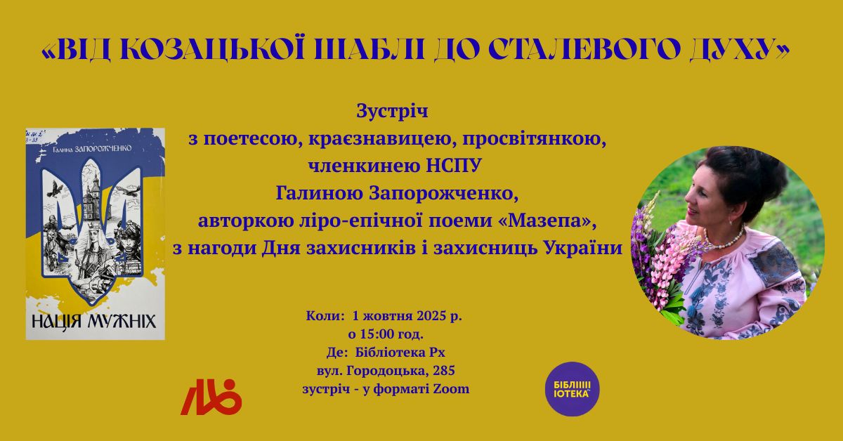 Це був той день, коли серце України билося особливо гучно, бо йшлося про найсвятіше – захист рідної землі від лютого ворога. У затишній залі Львівської муніципальної бібліотеки “Px” відбулася щира, глибоко зворушлива творча зустріч «Від козацької шаблі до сталевого духу».